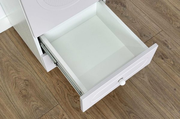 Модуль оснащён одной распашной дверцей и двумя вместительными выкатными ящиками в нижней части, предназначенными для хранения одежды, текстиля или аксессуаров. Внутреннее наполнение можно выбрать в зависимости от потребностей: шкаф может быть укомплектован полками или штангой для плечиков, что делает его удобным для хранения как сложенных вещей, так и одежды на вешалках.